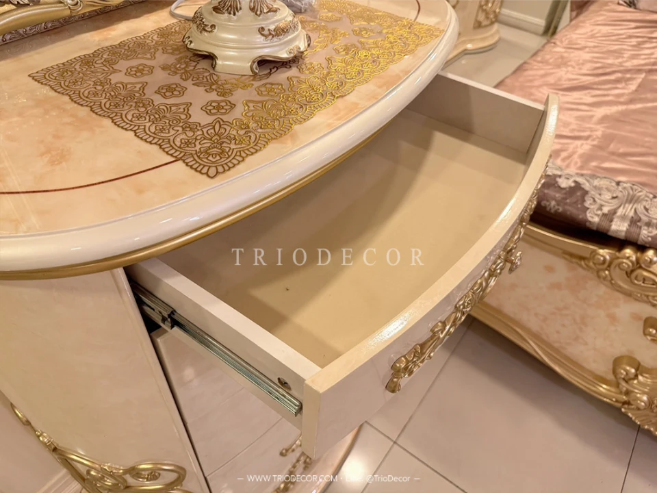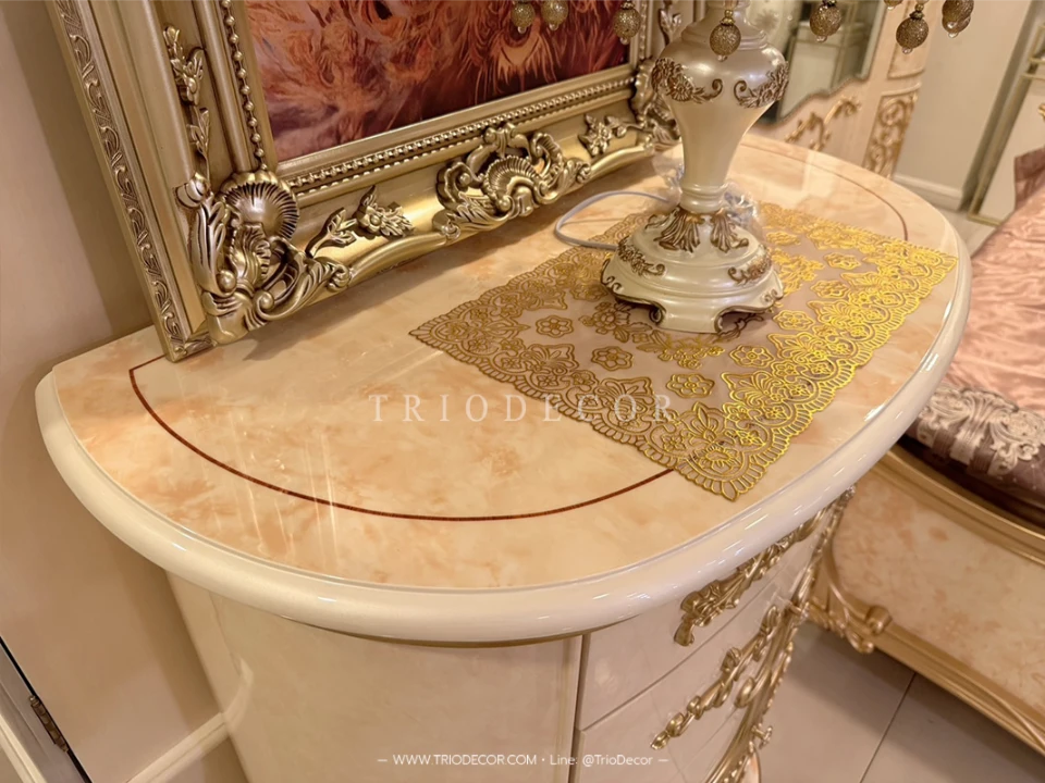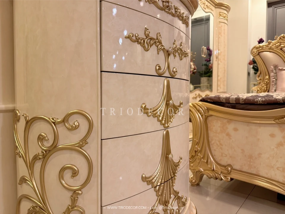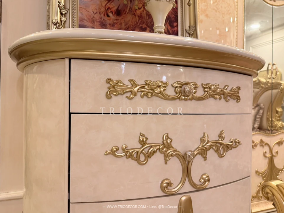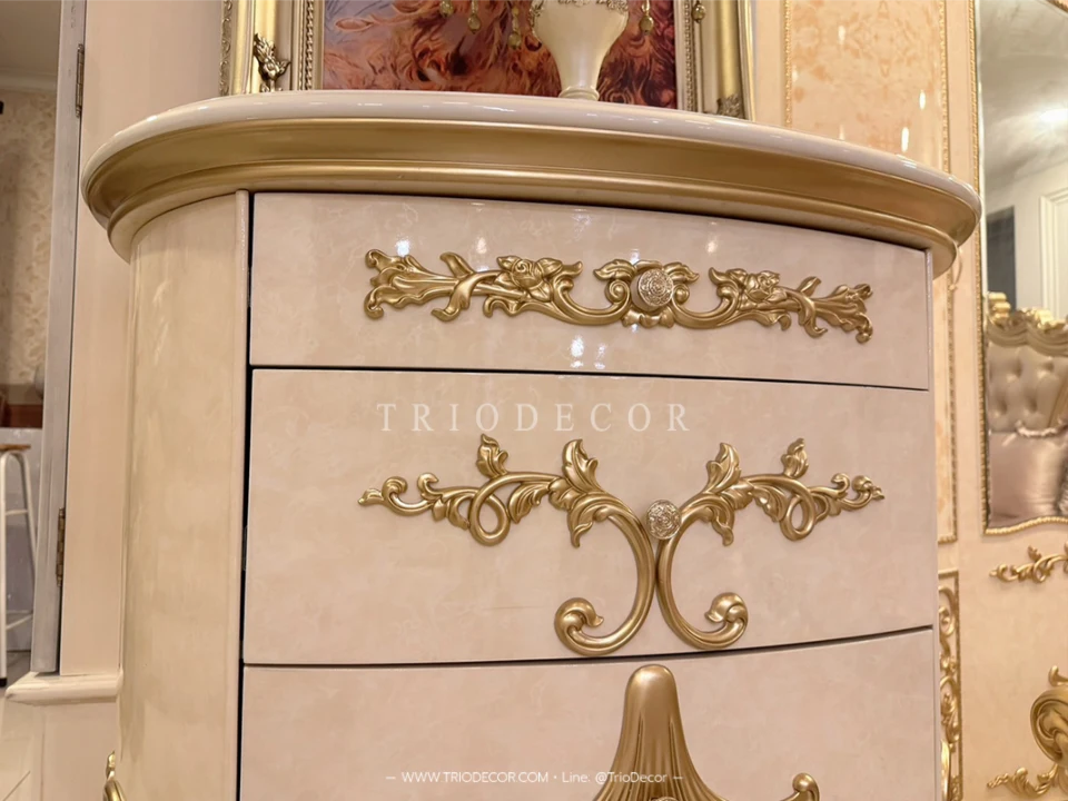 -ตู้ลิ้นชักสไตล์หลุยส์ สลักลายหลุยส์ทองคลาสสิคออริจินัลรอบตัว ดีไซน์ Curve โค้งหรูหราสวยงาม ผิวเรียบลายหินอ่อนสลับสีเบจประกายมุกตัดด้วยสีทองเชมเปญสุดหรู
